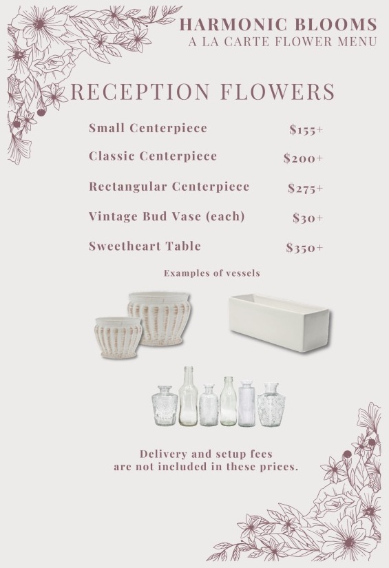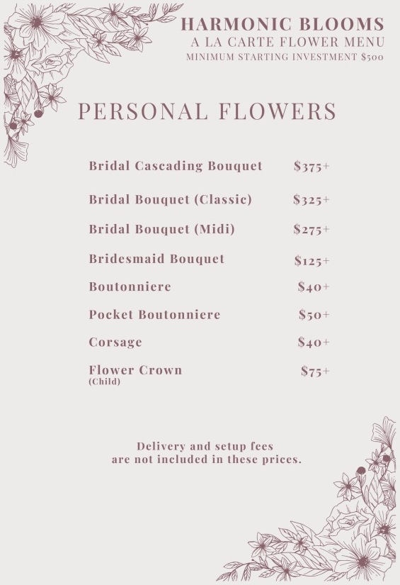 Our à la carte menu is perfect for those planning weddings, elopements, special events, celebrations and corporate gatherings. This is a designer's choice service allowing you to relax while we take care of all of the details.